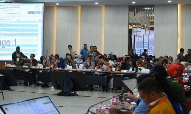 Jakarta, Badan Pengawas Pemilihan Umum - Pembukaan Rekapitulasi Hasil Penghitungan Perolehan Suara Tingkat Nasional dan Penetapan Hasil Pemilihan Umum Tahun 2019 dibuka dengan permasalahan surat mandat dari saksi peserta pemilu di Lantai II Kantor KPU, jalan Imam Bonjol, Jakarta, Sabtu (4/5/2019).