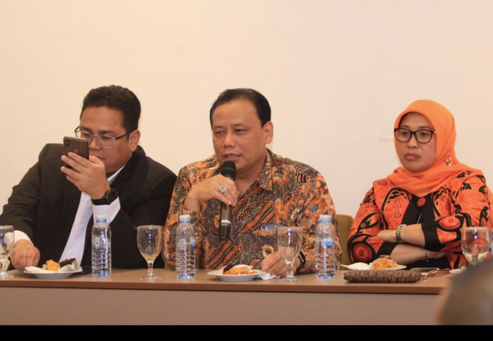 Ketua Bawaslu Abhan (tengah) menjabarkan perubahan Perbawaslu tak akan melarang mantan narapidana korupsi sebelum menutup kegiatan Peningkatan Kapasitas Kehumasan Dalam Pemberitaan dan Pengelolaan Media Sosial di Jakarta, Jumat (15/11/2019) malam/Foto: Bhakti Satrio