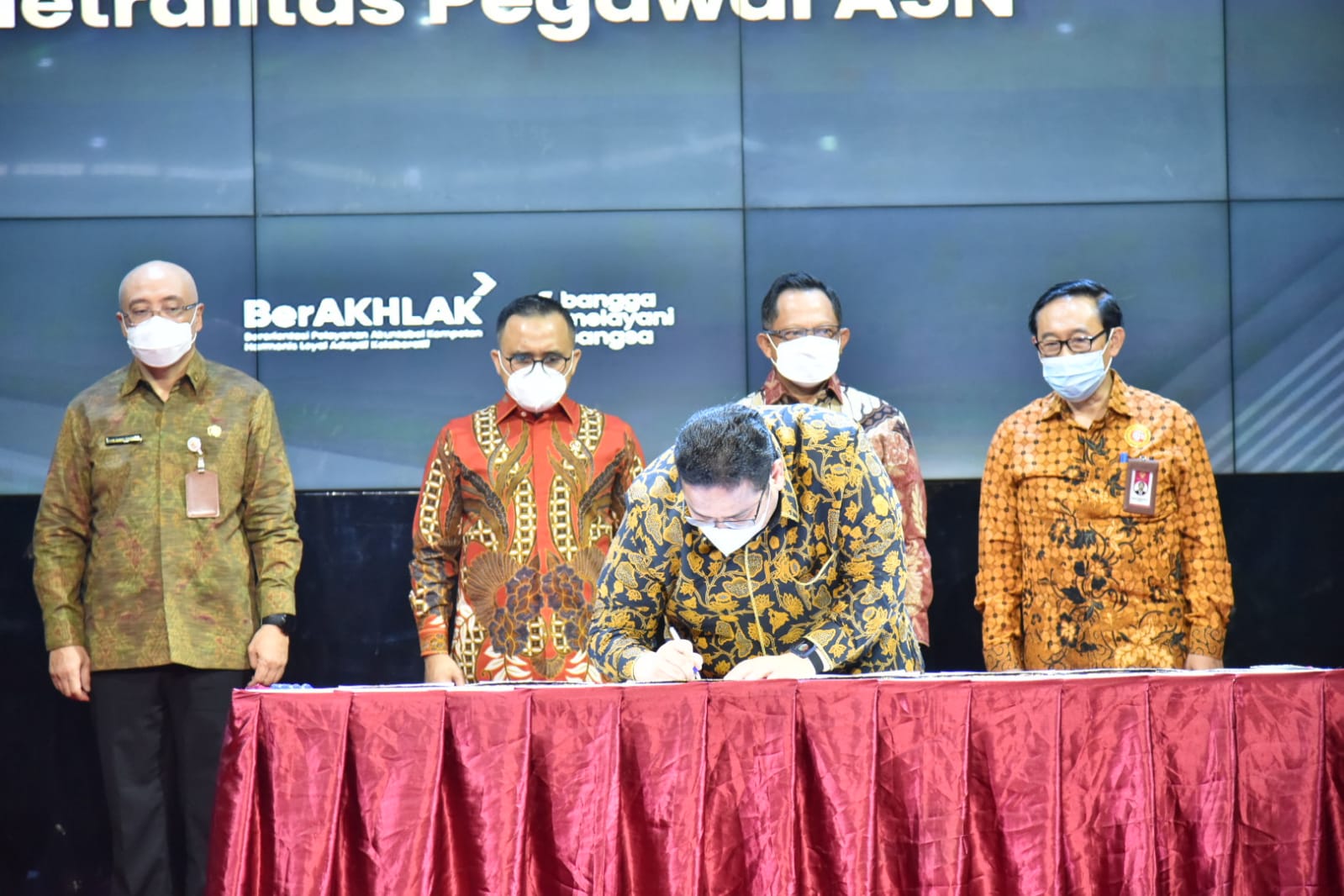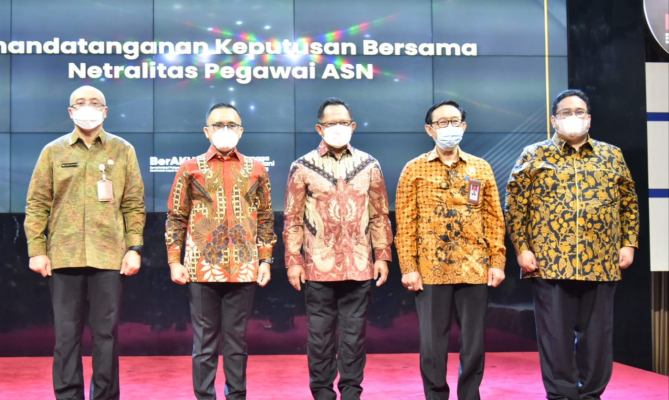 Jakarta, Badan Pengawas Pemilihan Umum - Dalam memastikan Pemilu 2024 mendatang berjalan bersih dan transparan, Bawaslu menandatangani Surat Keputusan Bersama (SKB) Netralitas Aparatur Sipil Negara (ASN) bersama Kementerian Dalam Negeri (Kemendagri), Kementerian Pendayagunaan Aparatur Negara dan Reformasi Birokrasi (KemenpanRB), Komisi Aparatur Sipil Negara (KASN), dan Badan Kepegawaian Negara (BKN).
