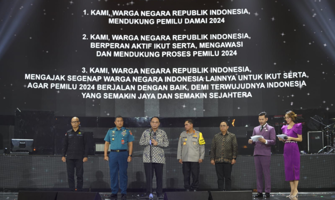 Dalam kesempatan itu juga, Menteri Komunikasi dan Informatika Budi Arie Setiadi membacakan Deklarasi Harmoni Pemilu Damai diikuti perwakilan dari Bawaslu KPU, Kominfo, TNI, Polri, dan Kejakasaan, mahasiswa, dan masyarakat umum. Berikut isi deklarasi tersebut.
