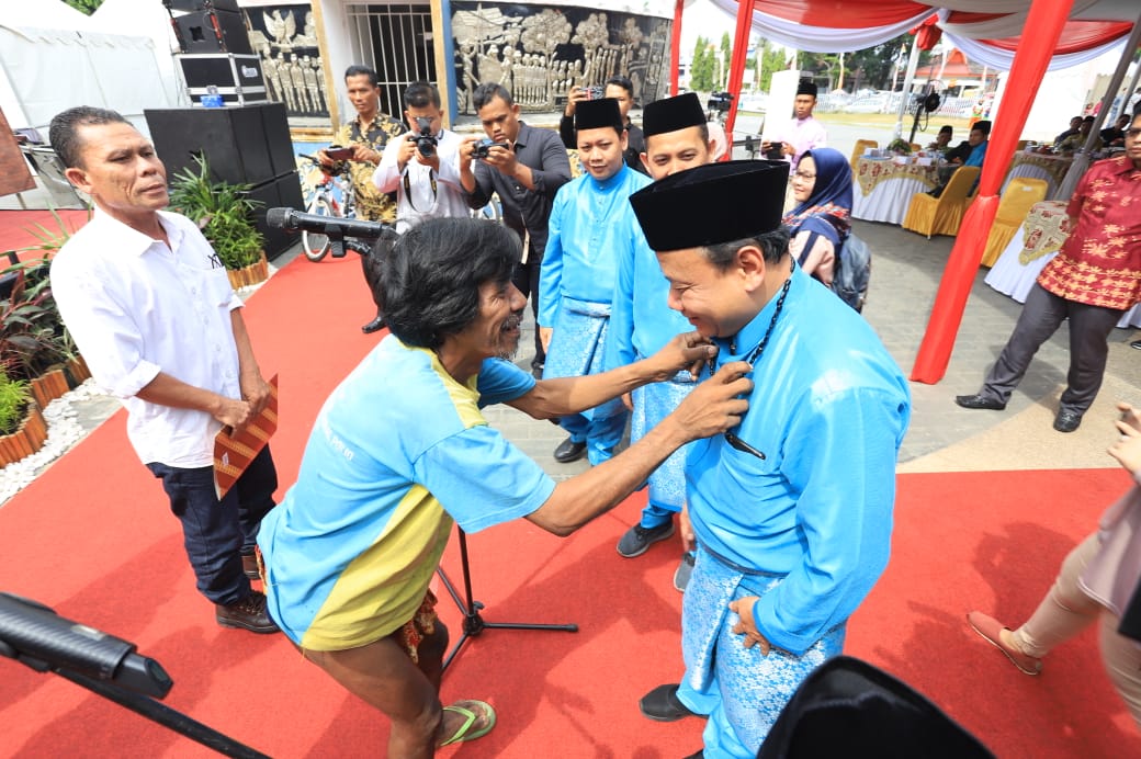 Salah seorang Suku Anak Dalam memberikan kalung sebagai bentuk ucapan selamat datang di Jambi kepada Ketua Bawaslu Abhan, Sabtu medio Februari 2020/Foto: Humas Bawaslu RI