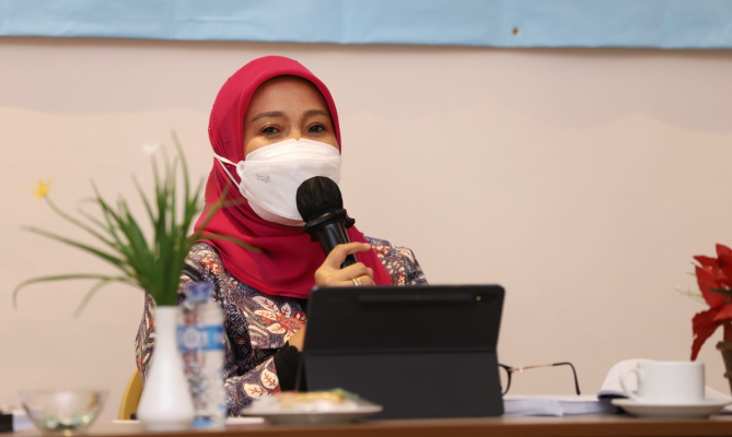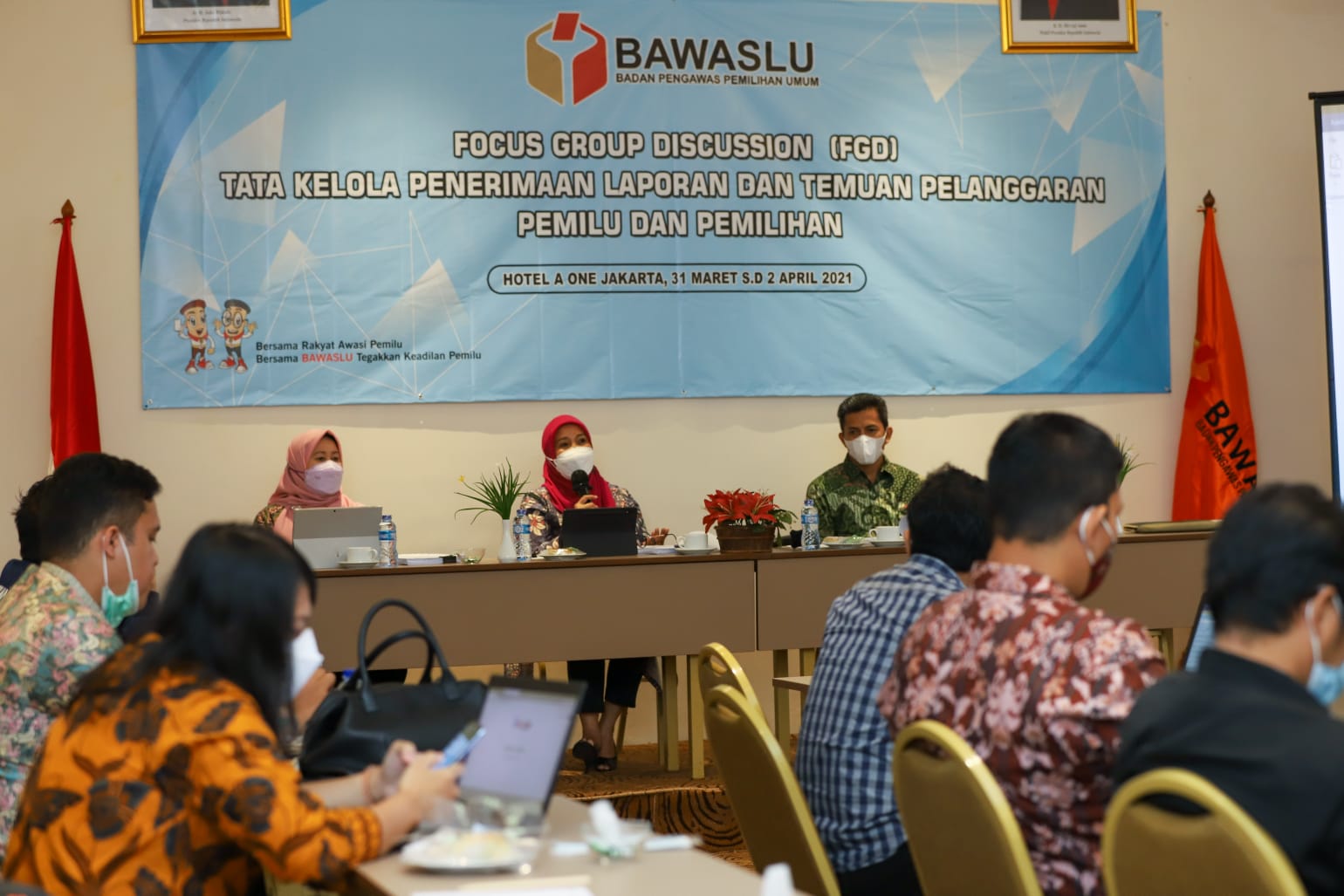 Anggota Bawaslu Ratna Dewi Pettalolo (jilbab merah) memberikan arahan dalam diskusi Tata Kelola Penerimaan Laporan dan Temuan Pelanggaran Pemilu dan Pemilihan di Jakarta, Kamis, (1/4/2021)/foto: Jaa Pradana
