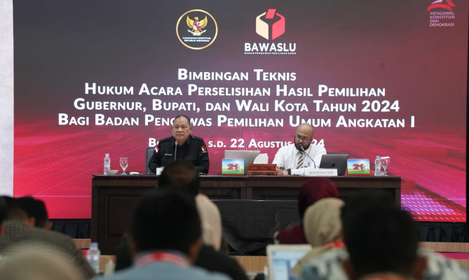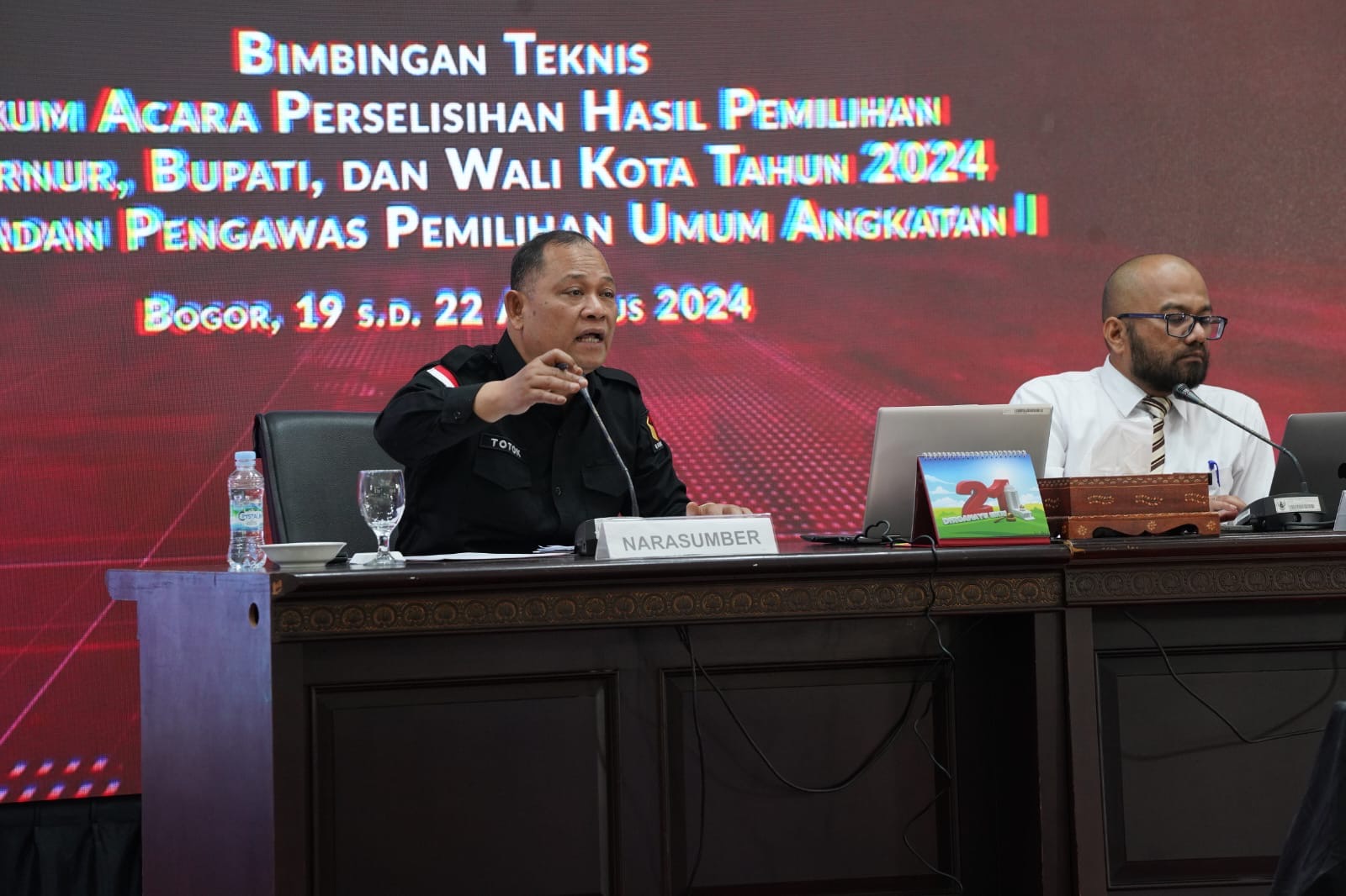 "Bawaslu bukan sebagai pihak yang saling berhadapan. Sebagai contoh, substansi keterangan tertulis yang masih memuat narasi bantahan yang seharusnya memuat deskripsi hasil pengawasan," tegasnya saat menjadi narasumber Bimbingan Teknis Hukum Acara Perselisihan Hasil Pemilihan Gubernur, Bupati dan Wali Kota Tahun 2024 bagi Bawaslu Angkatan I, di Cisarua Kabupaten Bogor, Senin, (20/8/2024).