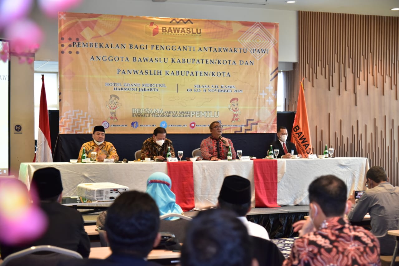 Jakarta, Badan Pengawas Pemilihan Umum – Sebanyak 33 pimpinan Bawaslu maupun Panwaslih Kabupaten/Kota yang dilantik pergantian antarwaktu (PAW) selama kurun tahun 2021, termasuk enam pimpinan Bawaslu Kabupaten yang baru dilantik hari ini  mendapat pembekalan. Ketua Bawaslu Abhan bersama Koordinator Divisi Pengawasan dan Hubungan Antar Lembaga Bawaslu Mochammad Afifuddin, dan Koordinator Divisi Hukum, Humas, dan Datin Fritz Edward Siregar mengingatkan agar menjaga integritas sebagai penyelenggara pemilu.