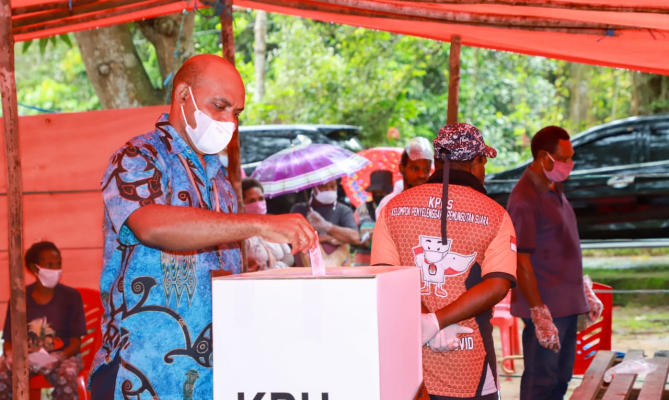 Boven Digoel, Badan Pengawas Pemilihan Umum - Rintik hujan mewarnai pelaksanaan pemungutan suara ulang (PSU) di sebagian wilayah Boven Digoel. Ketua Bawaslu Abhan pun mengapresiasi perjuangan pengawas pemilu yang tetap melakukan tugas pengawasan secara melekat PSU Pilkada 2020, termasuk dalam pendistribusian logistik untuk TPS sejak 14 Juli 2021.