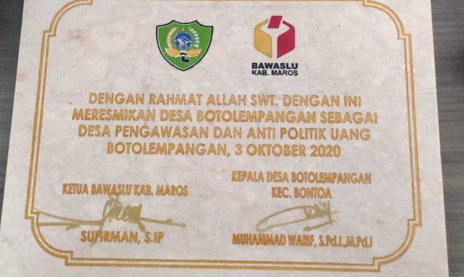 Maros, Badan Pengawas Pemilihan Umum - Guna mengarustamakan pengawasan partisipasif oleh masyarakat, Bawaslu Kabupaten Maros meresmikan Desa Bontolempangan di Kecamatan Bontoa sebagai desa antipolitik uang. Desa ini merupakan desa ketiga di Kabupaten Maros yang menjadi desa sadar penwasan pemilu yang menolak politik uang.
