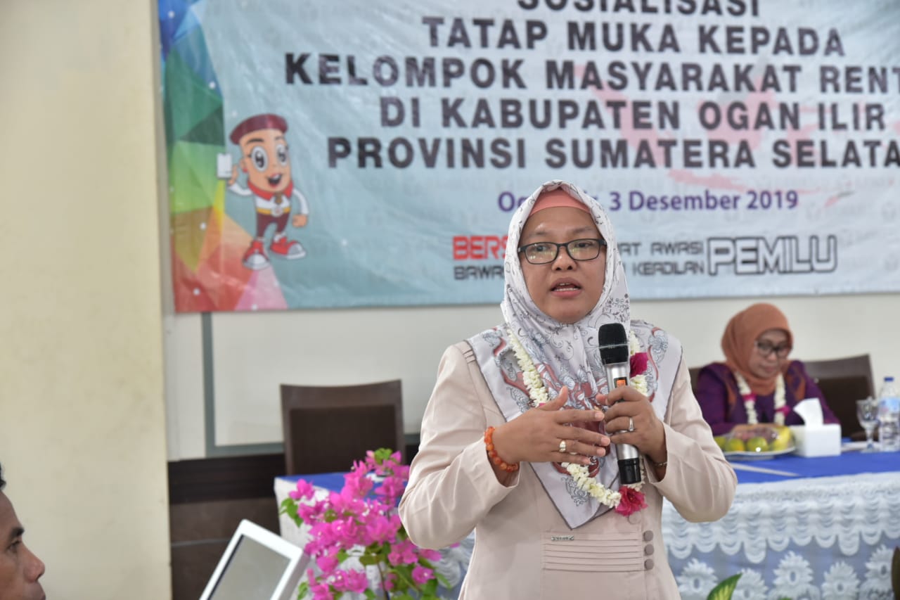 Dosen Fakultas Hukum Universitas Indonesia Widyaningsih saat menjadi narasumber kegiatan Sosialisasi Tatap Muka kepada Kelompok Masyarakat Rentan Terkait Persiapan Pengawasan Pilkada 2020 di Kabupaten Ogan Ilir, Sumatra Selatan, Selasa 3 Desember 2019/Foto: Irwan