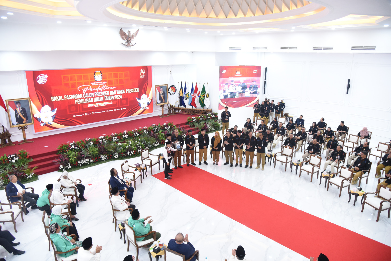 Berdasarkan pantauan, bapaspon yang pertama mendaftar yakni pasangan Anies Rasyid Baswedan dan Muhaimin Iskandar. Pasangan yang diusung oleh Partai Nasional Demokrasi (NasDem), Partai Keadilan Sejahtera (PKS), dan Partai Kebangkitan Bangsa (PKB) ini menyerahkan berkas-berkas pendaftaran ke Ketua KPU Hasyim Asy'ari pada pukul 10.16 WIB.