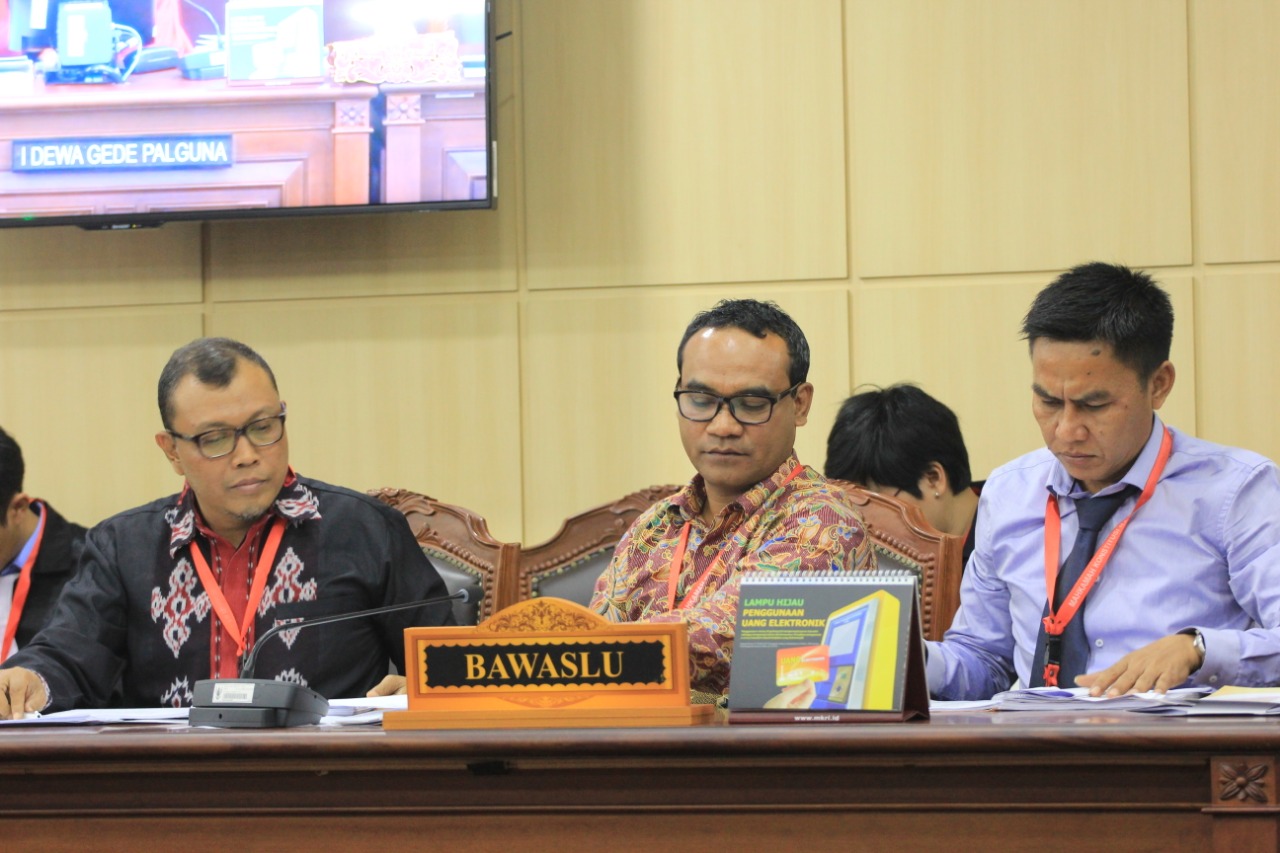 Ki-kan: Ketua Bawaslu NTB Muhammad Khuwailid, Koordinator Divisi Penindakan Pelanggaran, Umar Achmad Seth dan Anggota Bawaslu NTB Divisi Hukum, Data dan Informasi Suhardi memberikan keterangan atas 7 permohonan laporan sengketa hasil pemilihan legislatif (Pileg) NTB di Ruang Sidang Panel 3, Jakarta, Kamis 18 Juli 2019/Foto: Reyn Gloria