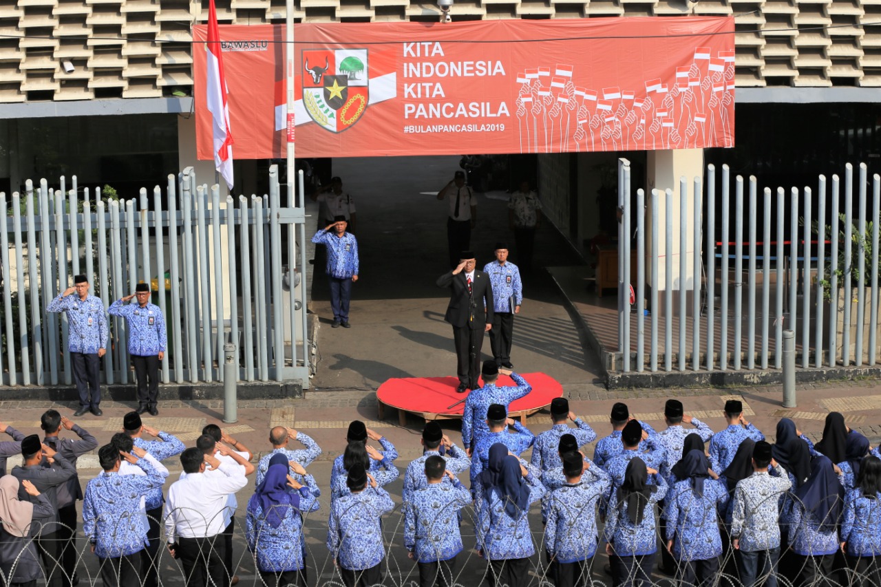 Jakarta, Badan Pengawas Pemilihan Umum - Anggota Bawaslu Fritz Edward Siregar memandang Hari Lahir Pancasila dapat menjadi momentuk untuk membangun kesadaran masyarakat. Baik dalam hal saling menghormati, bekerja sama, dan bergotong royong untuk menyelesaikan permasalahan yang ada. Hal tersebut dia katakan saat menjadi menjadi inspektur upacara peringatan Hari Lahir Pancasila di depan Gedung Bawaslu, Jakarta, Sabtu (1/6/2019).