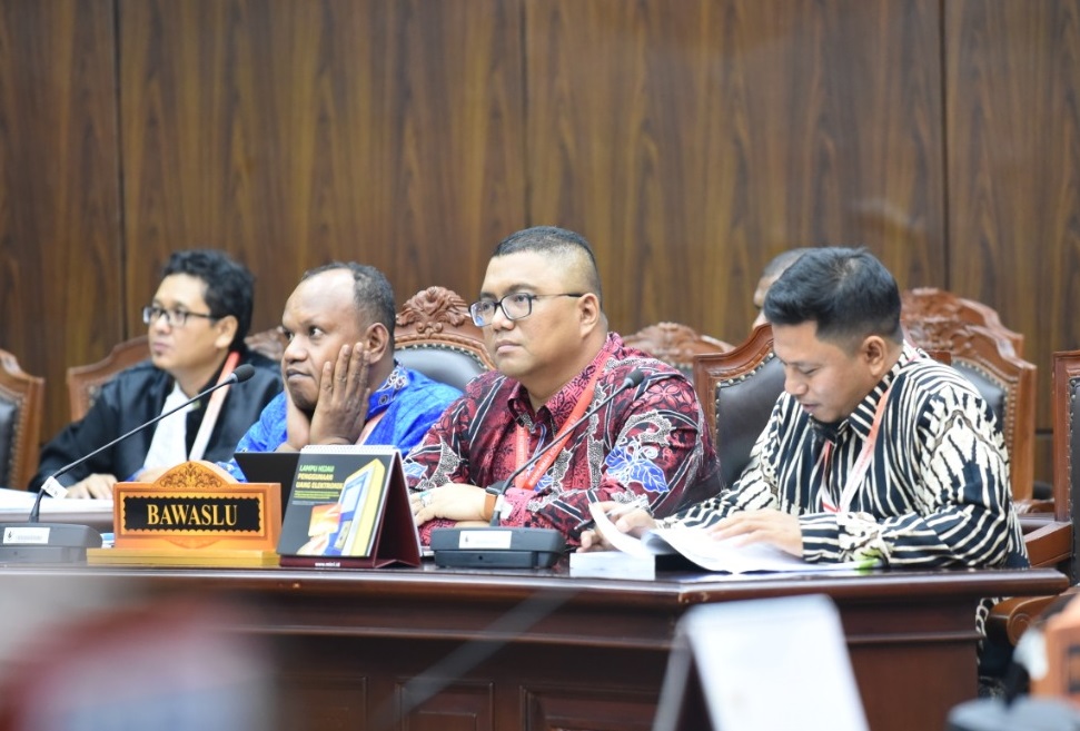 Anggota Bawaslu Fritz Edward Siregar (tengah berbatik merah) saat mendampingi Bawaslu Papua Barat dalam sidang sengketa pemilihan legislatif di Gedung Mahkamah Konstitusi, Kamis, 11 Juli 2019/Foto: Dinar Safa