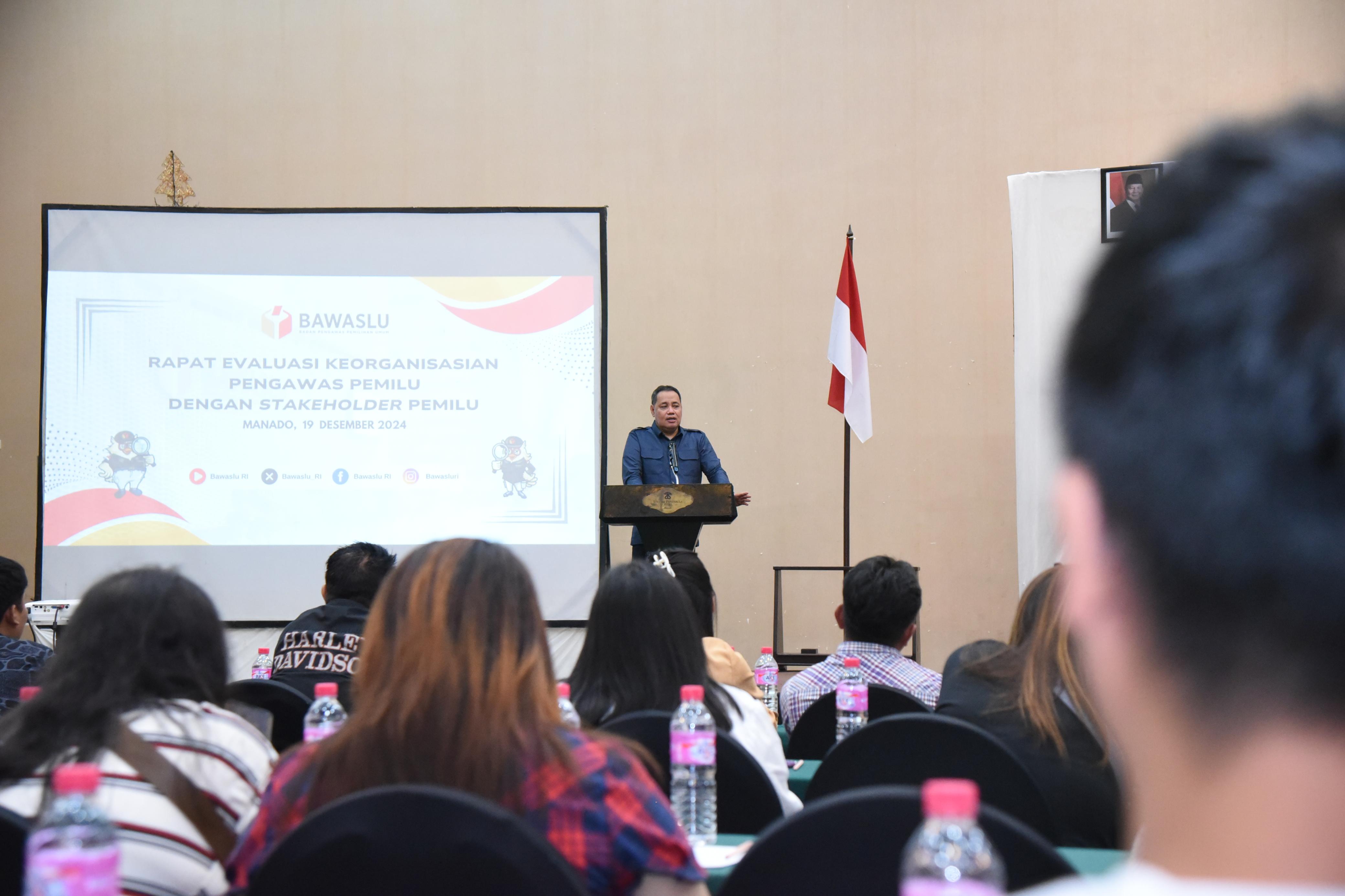 Anggota BawasluHerwyn JH Malonda saat membuka dan memberikan arahan dalam Rapat Evaluasi Keorganisasian Pengawas Pemilu dengan Stakeholder Pemilu di Manado, Kamis (19/11/2024).