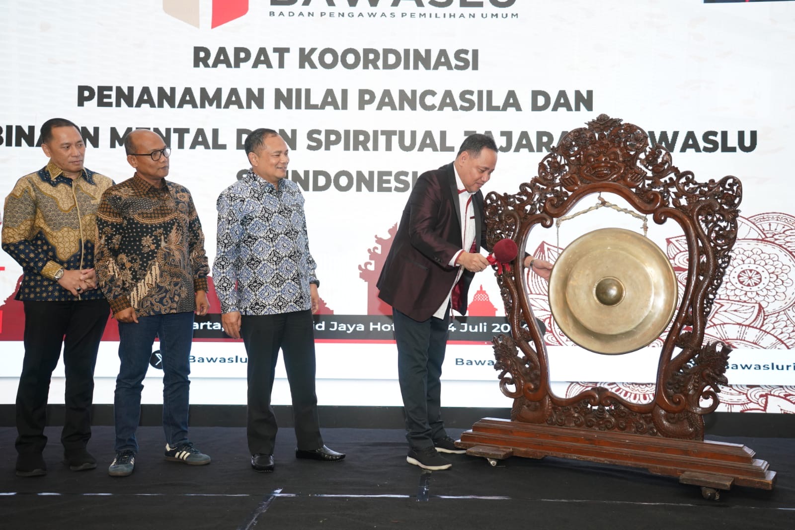 Anggota Bawaslu Herwyn JH Malonda memukul gong sebagai tanda dibukanya kegiatan Rapat Koordinasi Penanaman Nilai Pancasila dan Pembinaan Mental dan Spiritual Jajaran Bawaslu se-Indonesia, di Jakarta, Jumat (12/7/2024) malam/foto: Publikasi dan Pemberitaan Bawaslu.