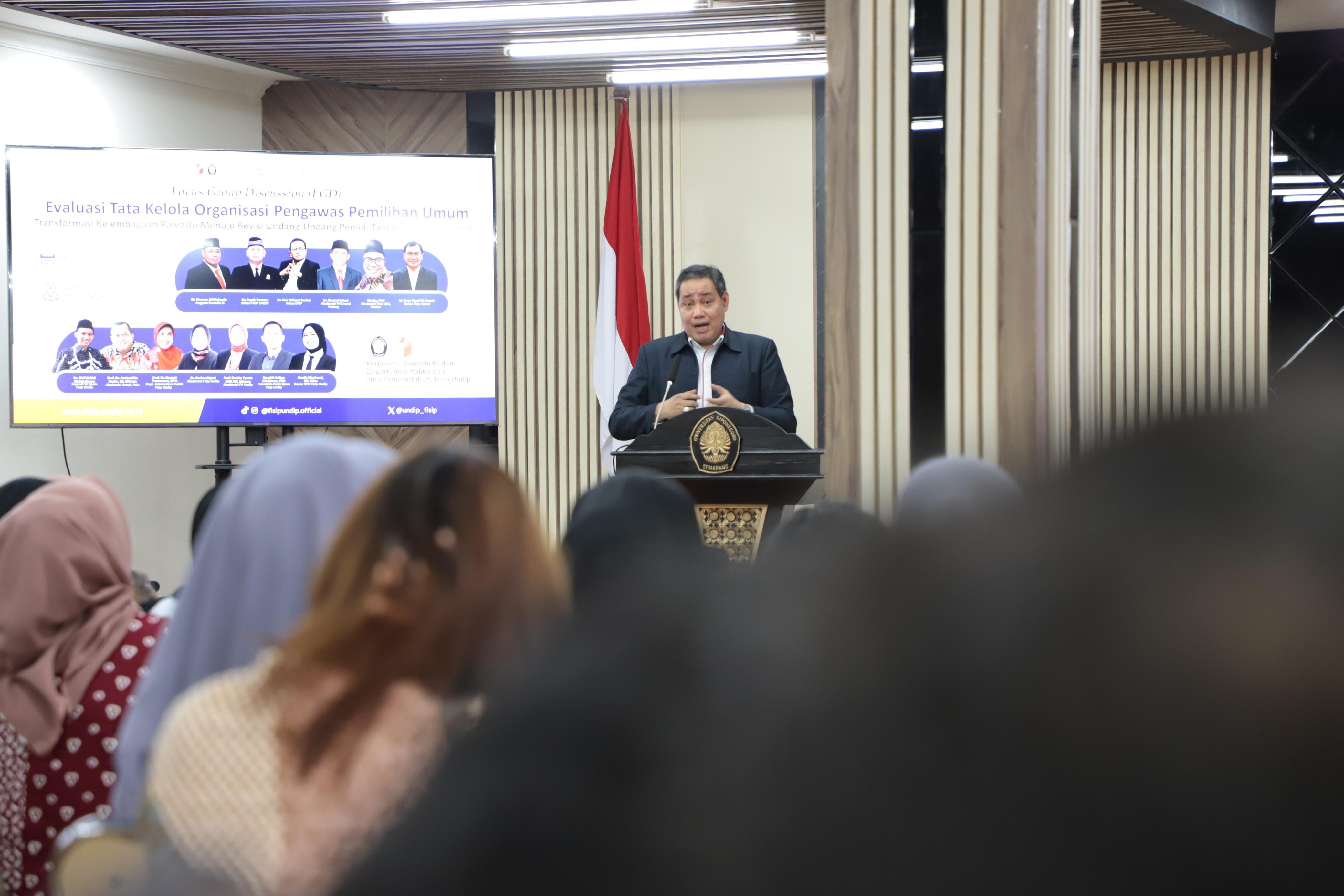 Dalam Focus Group Discussion (FGD) Evaluasi Tata Kelola Organisasi Pengawas Pemilu yang digelar di Fakultas Ilmu Sosial dan Ilmu Politik (Fisip) Universitas Diponegoro (Undip), Kamis (11/12/2025), Herwyn menyampaikan apresiasi kepada lingkungan akademik yang aktif membaca perkembangan sosial, politik, dan teknologi. Ia menjelaskan forum ini menghadirkan narasumber dari bidang sosial politik dan hukum untuk memberikan gambaran menyeluruh terhadap tantangan kelembagaan Bawaslu.