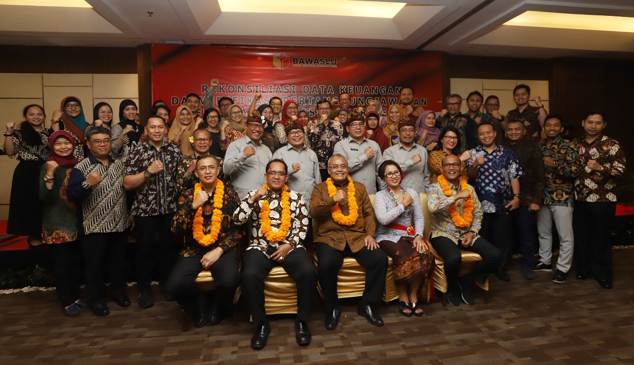 Sekjen Bawaslu Gunawan Suswantoro berfoto bersama jajarang pejabat Bawaslu dan Panwaslu Luar Negeri dalam acara Rekonsiliasi Data Keuangan dan Verifikasi Pertanggungjawaban Keuangan Panwaslu Luar Negeri Tahun Anggaran 2019 di Bali, Kamis 18 Juli 2019/Foto: Nurisman