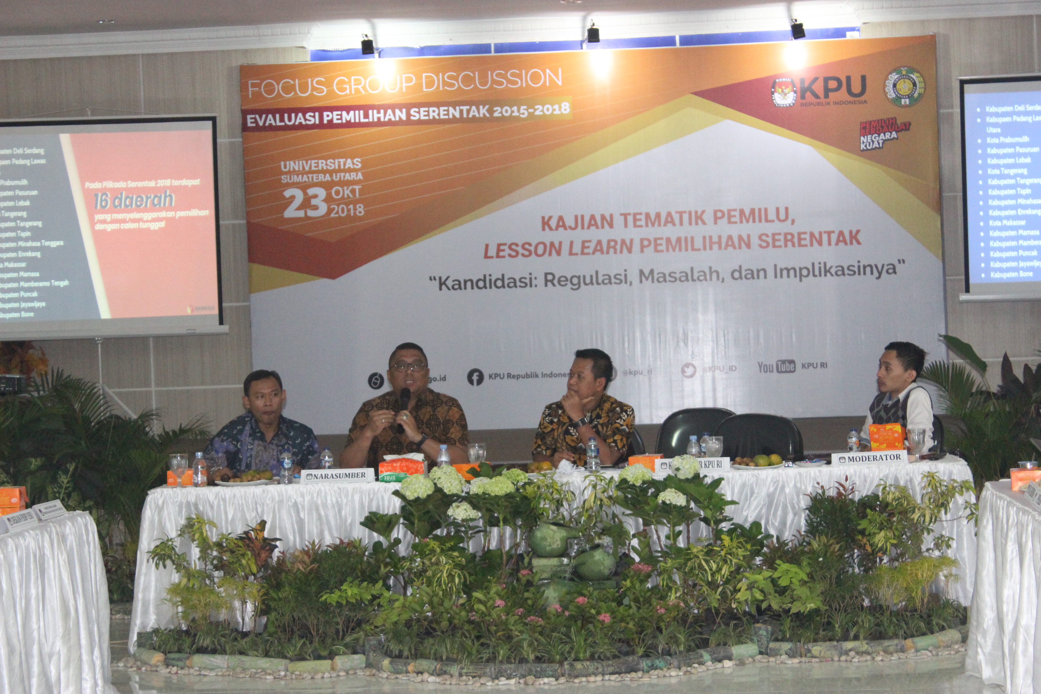 Medan, Badan Pengawas Pemilu - Pada tahap simulasi calon tunggal, Bawaslu mencatat tidak adanya informasi bagi pemilih di TPS ketika kotak kosong mendapatkan suara lebih besar dari calon tunggal. Padahal dalam konteks calon tunggal, informasi yang tidak memadai bagi pemilih berpotensi mempengaruhi preferensi pemilih di TPS. Hal itu disampaikan Anggota Bawaslu Fritz Edward Siregar dalam Focus Group Discussion (FGD) Evaluasi Pemilihan Serentak 2015 - 2018 di Medan, Selasa (23/10/2018).