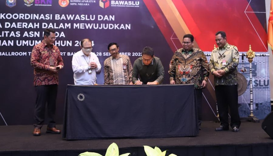 Bali, Badan Pengawas Pemilihan Umum - Bawaslu menginisiasi penandatanganan pakta integritas Penjabat Pembina Kepegawaian (PPK) seluruh Indonesia dalam menegakkan netralitas Aparatur Sipil Negara (ASN) Pemilu dan Pemilihan 2024. Pakta integritas ini nantinya akan disosialisasikan oleh PPK terhadap jajaran ASN untuk senantiasa mewujudkan penyelenggaraan Pemilu dan Pemilihan 2024 yang jujur, adil, serta demokratis.