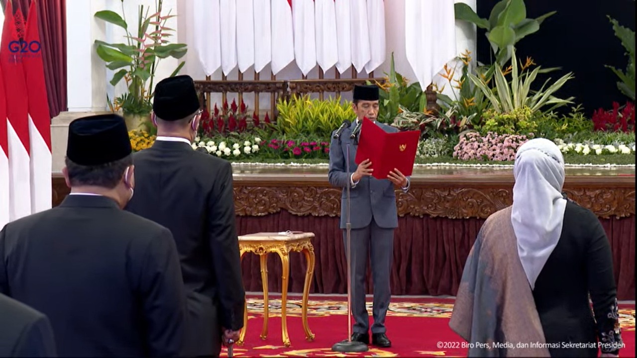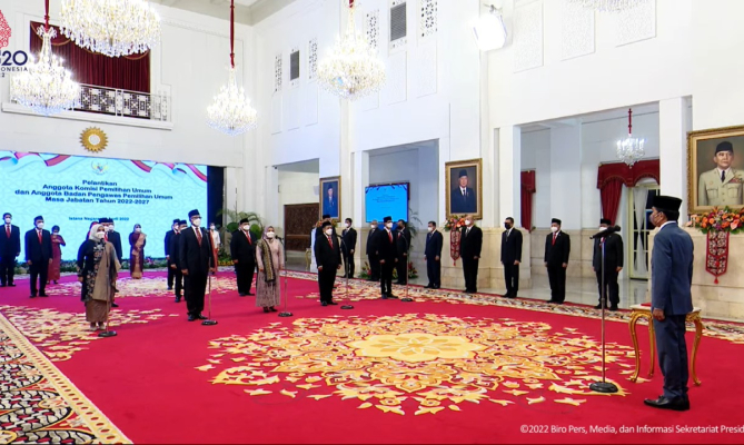 Presiden RI saat membacakan sumpah janji jabatan pimpinan KPU dan Bawaslu dan pimpinan KPU periode 2022-2027 di Istana Negara, Jakarta, Selasa (12/4/2022).