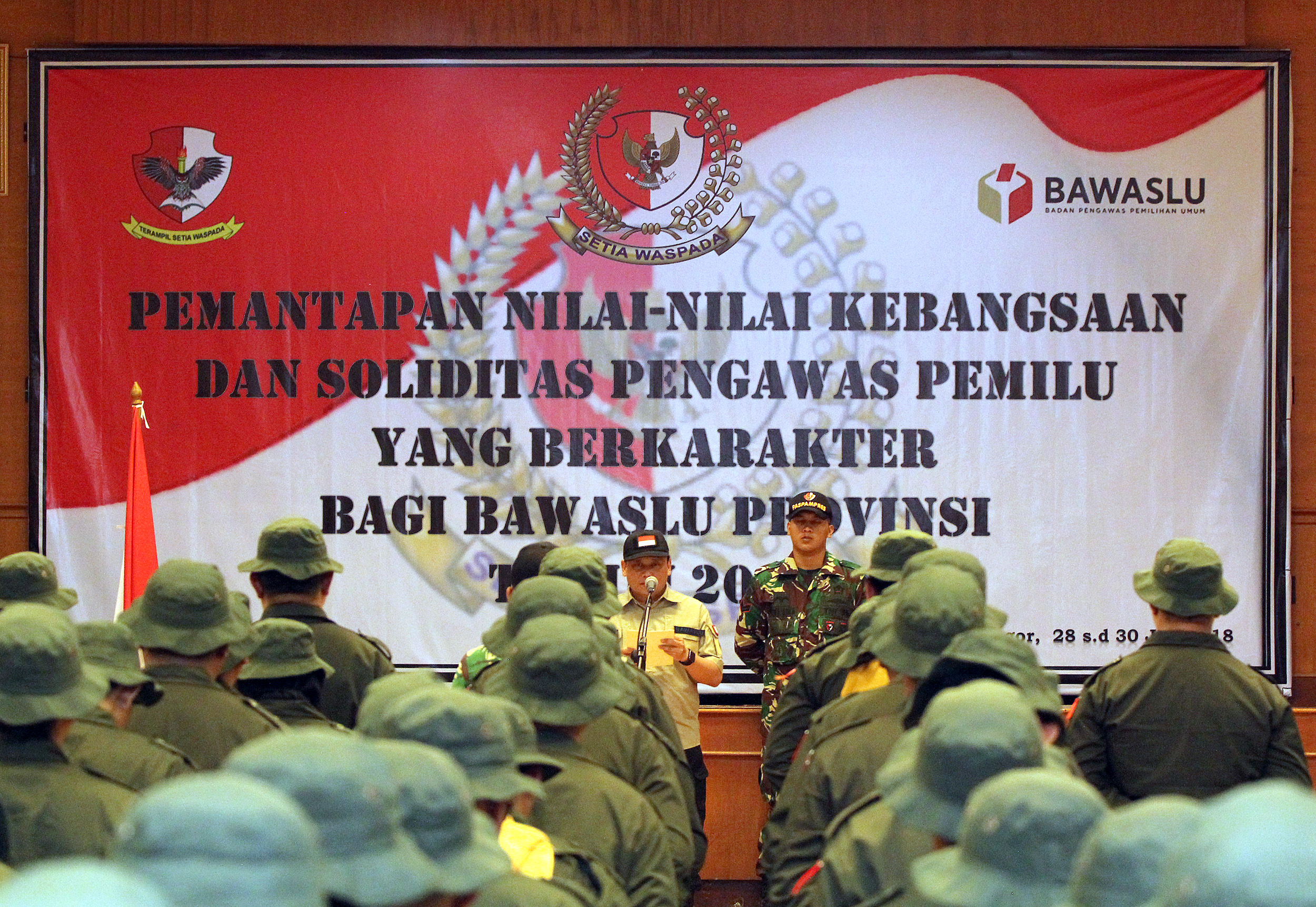 Bogor, Badan Pengawas Pemilu - Ketua Bawaslu, Abhan, membuka kegiatan Pemantapan Nilai-Nilai Kebangsaan dan Soliditas Pengawas Pemilu yang berkarakter bagi Bawaslu Provinsi Tahun 2018 di Pusat Pendidikan dan Latihan Markas Komando Paspamres Group C, Lawang Gintung, Bogor, Sabtu Malam, (28/7/2018). Secara simbolis pembukaan kegiatan ini ditandai dengan penyematan tanda peserta oleh Ketua Bawaslu kepada perwakilan peserta.