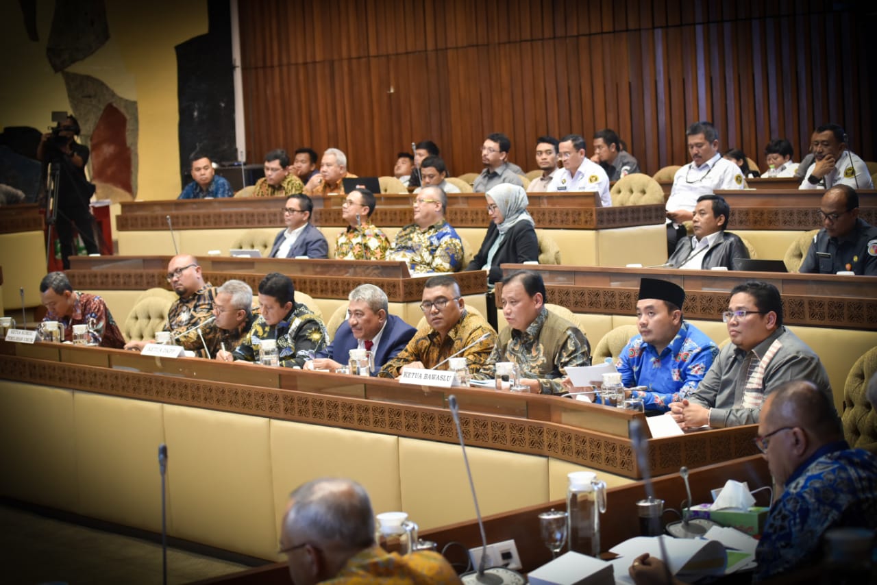 Ketua Bawaslu Abhan (batik hijau) bersama Anggota Bawaslu Rahmat Bagja, M. Afifuddin, Ratna Dewi Pettalolo dan Fritz Edward Siregar melakukan Rapat Dengar Pendapat (RDP) dengan Komisi II DPR RI di Jakarta, Selasa (14/01/2020)