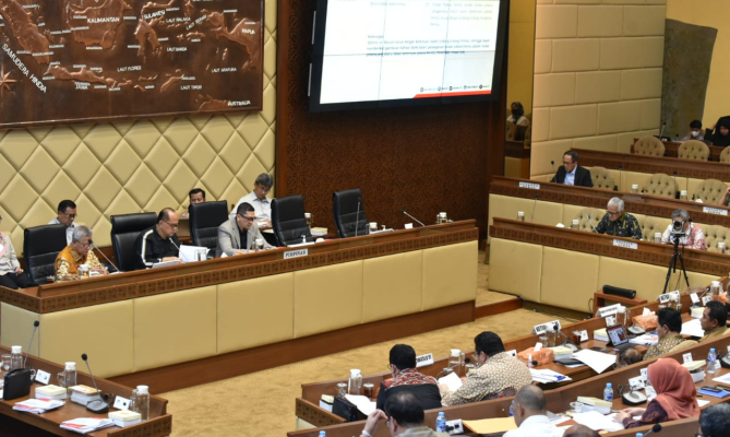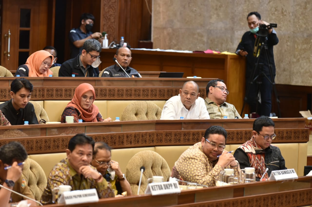 Ketua Bawaslu Rahmat Bagja (dua dari kanan bawah) bersama empat anggota Bawaslu; Puadi, Herwyn JH Malonda, Totok Hariyono, dan Lolly Suhenty menghadiri RDP di gedung DPR/MPR RI, Jakarta, Selasa (24/01/2023)/foto: Publikasi dan Pemberitaan Bawaslu.