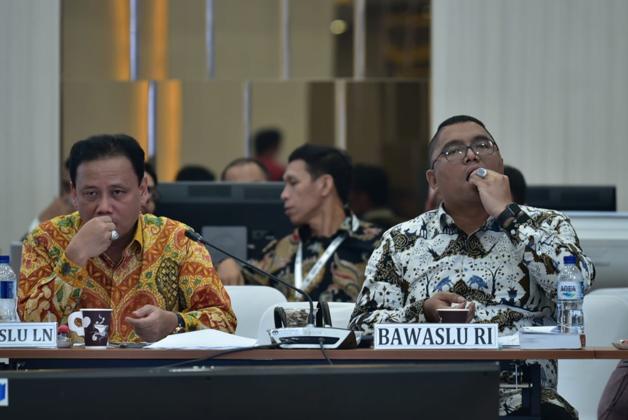 Dalam ruang sidang juga hadir Ketua Bawaslu, Abhan dan Anggota Bawaslu, Mochammad Afifudin. Keduanya diskusi sambil menikmati kuaci yang ada di meja.