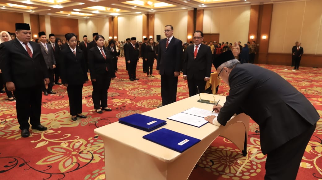 Sekjen Bawaslu Gunawan Suswantoro menandatangani pakta integritas 183 pejabat admiinistrator Bawaslu dalam pelantikan pejabat pengawas pemilu di Jakarta, Jumat (28/2/2020). Foto : Humas Bawaslu RI