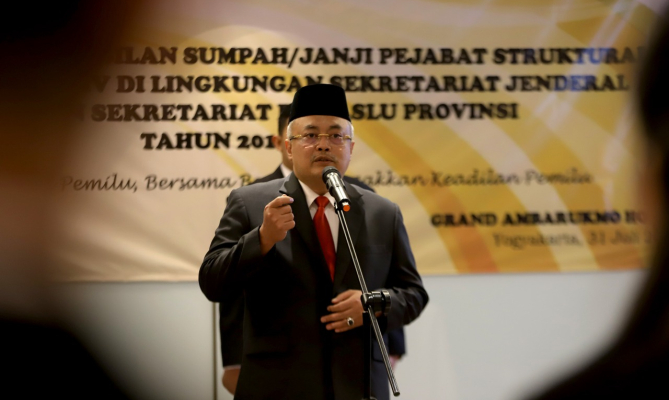 Sekjen Bawaslu Gunawan Suswantoro melantik 19 pejabat Bawaslu eselon III dan eselon IV di Yogyakarta, Rabu 31 Juli 2019/Foto: Nurisman