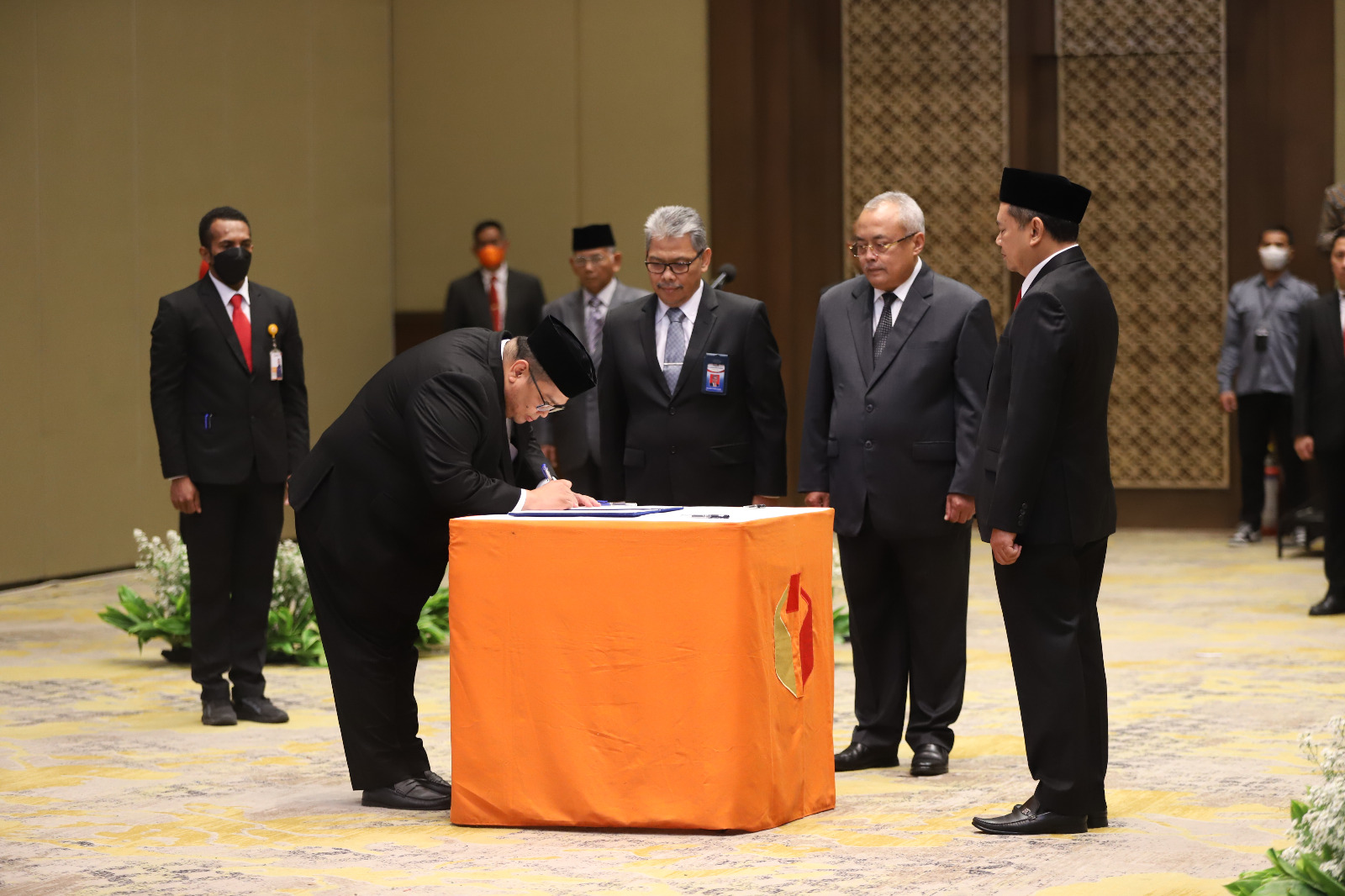 Ketua Bawaslu Rahmat Bagja (kiri membungkuk) saat membubuhkan tanda tangan dalam naskah pelantikan Ichsan Fuady (kanan dengan peci hitam) sebagai Sekretaris Jenderal Bawaslu di Jakarta, Jumat 17 Februari 2023/Foto: Pemberitaan dan Publikasi Bawaslu RI