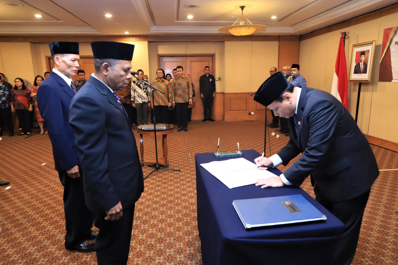 Ketua Bawaslu Abhan menyodorkan tandatangan pakta integritas kepada sembilan PAW Anggota Bawaslu daerah yang baru saja dilantik di Jakarta, Senin (27/1/2020). Foto : Irwan