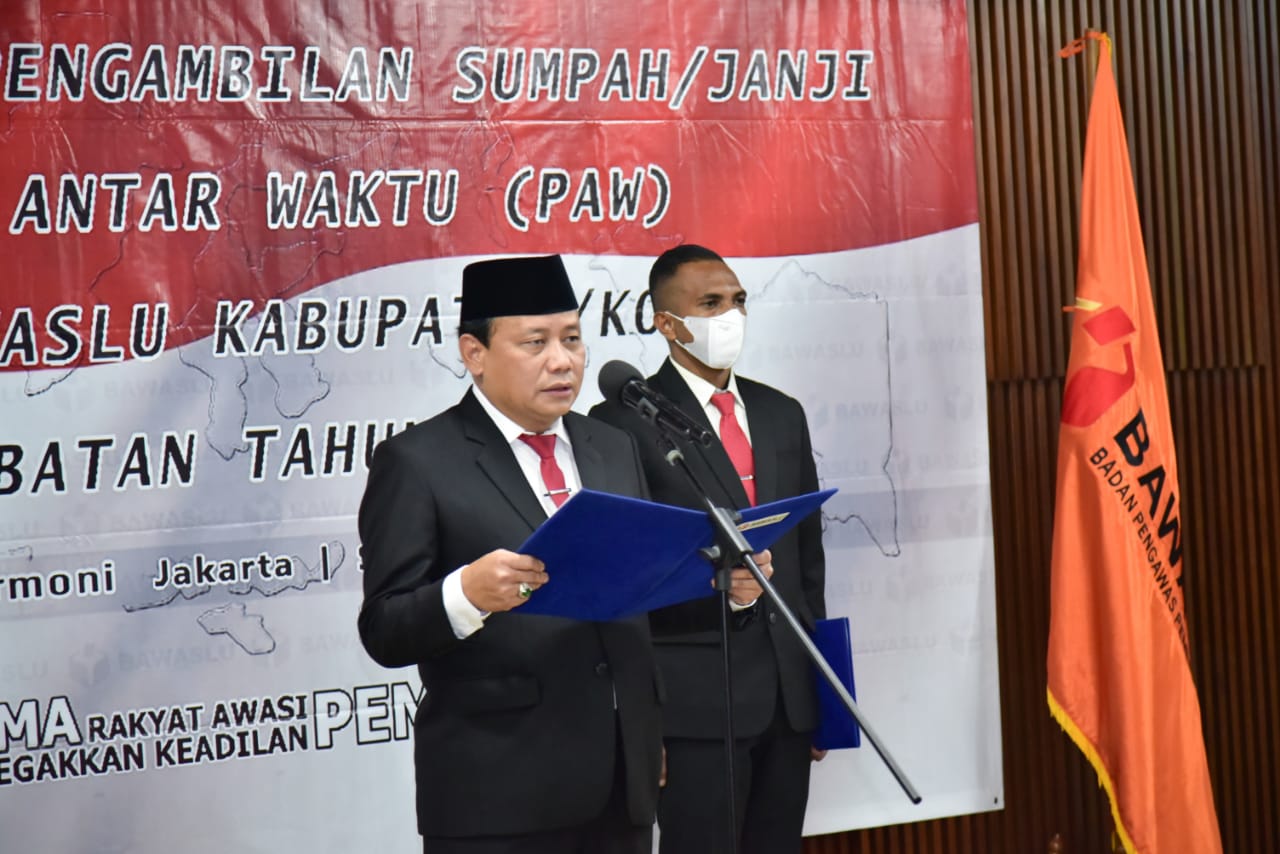 Jakarta, Badan Pengawas Pemilihan Umum - Ketua Bawaslu Abhan melakukan pengambilan sumpah pergantian antarwaktu (PAW) pimpinan Bawaslu dari enam kabupaten. Keenam anggota terlantik tersebut yaitu Engkus Kusnadi dari Bawaslu Kabupaten Karawang, Aksan Mustofa dari Bawaslu Kabupaten Banyuwangi. Lalu, Khoirul Muluk untuk Bawaslu Kabupaten Banyuasin, Rodi Hartono untuk Kabupaten Empat Lawang, Ahmad Sahlan untuk Kabupaten Lampung Selatan, dan Alex untuk Kabupaten Mahakam Ulu.