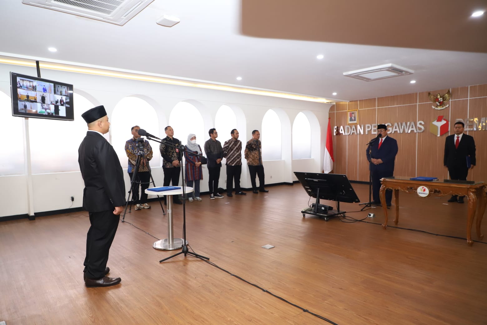 Jakarta, Badan Pengawas Pemilihan Umum - Ketua Bawaslu Rahmat Bagja melantik sembilan Anggota Bawaslu kabupaten/kota dan Panitia Pengawas Luar Negeri (Panwas LN) sekaligus mengambil sumpah jabatan Pengganti Antar Waktu (PAW). Pelantikan ini dilakukan luar jaringan (luring) di Kantor Bawaslu RI dan dalam jaringan (daring) dari Kantor Bawaslu setempat.