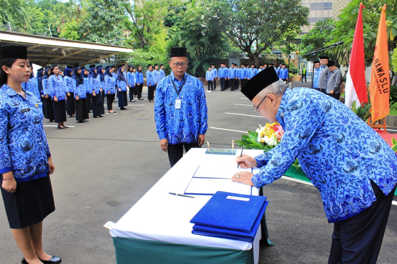 Sekjen Bawaslu Gunawan Suswantoro menandatangani fakta integritas saat pengambilan sumah calon PNS menjadi PNS Bawaslu angkatan ketiga tahun ajaran 2018 di Gedung Bawaslu, Senin 10 Januari 2020/Foto: Humas Bawaslu RI
