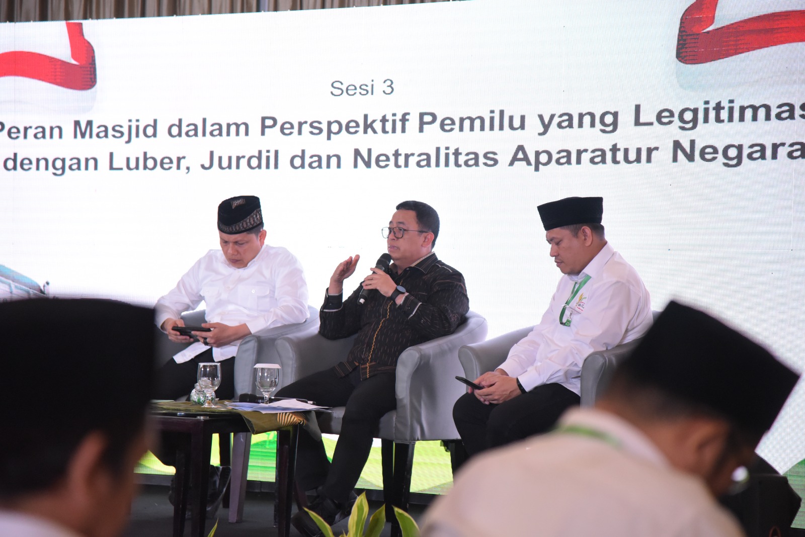 Anggota Bawaslu Puadi saat menjadi pembicara dalam Rakernis Pengurus Besar Masyarakat Cinta Masjid Indonesia, di Jakarta, Sabtu (16/12/2023).