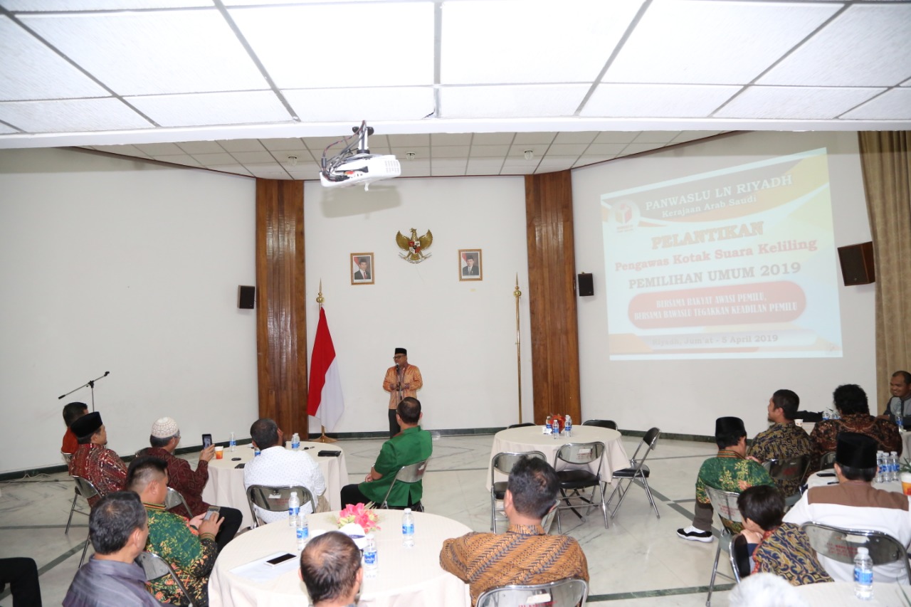Riyadh, Arab Saudi, Badan Pengawas Pemilu - Ketua Panitia Pengawas Pemilu Luar Negeri (Panwaslu LN) Riyadh Unsil Habieb Mansur, melantik lima Petugas Pengawas Pemilu Kotak Suara Keliling (KSK) wilayah kerja PPLN Riyadh, Arab Saudi, Jumat (5/4/2019), di Gedung Serba Guna KBRI Riyadh.