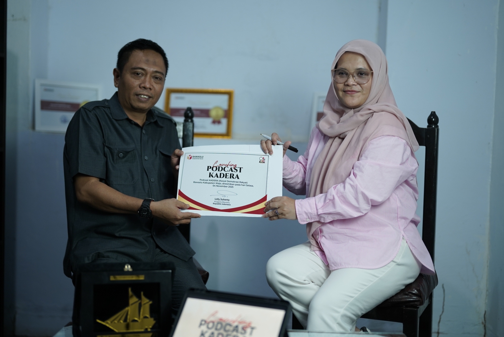 Wajo, Badan Pengawasan Pemilihan Umum- Anggota Bawaslu Lolly Suhenty memberikan apresiasi atas peluncuran podcast Kadera (Kawal Demokrasi Rakyat) yang digagas Bawaslu Kabupaten Wajo, Selasa (4/11/2025). Anggota Bawaslu Lolly Suhenty menilai inovasi tersebut sebagai langkah progresif dalam memperkuat literasi pengawasan pemilu di tengah derasnya arus informasi digital.