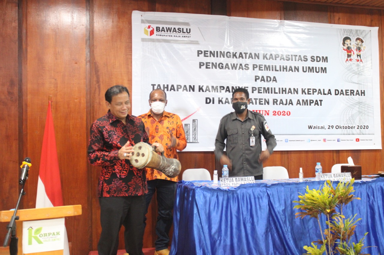 Ketua Bawaslu Abhan (kiri) menabuh gendang sebagai peresmian pembukaan Bimtek bagi Pengawas pemilu se-Kabupaten Raja Ampat, Kamis (29/10/2020). Foto: Mario Wiran/ Bawaslu Raja Ampat