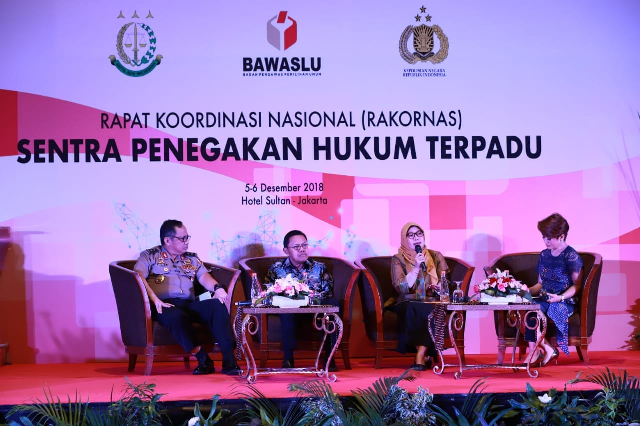 Anggota Bawaslu RI Ratna Dewi Pettalolo bersama dari unsur Kepolisian dan Kejaksaan dalam Rakornas Sentra Gakkumdu, di Jakarta, Rabu (5/12/2018).