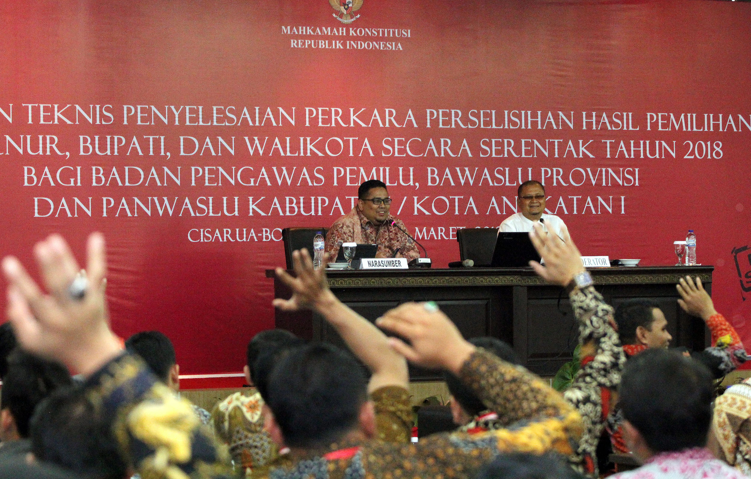 “Sekarang bagaimana cara menyusun dan menyiapkan format keterangan pihak terkait dan juga tanggapan pihak terkait guna menyamakan pemahaman terhadap hukum acara penyelesaian sengketa di MK,” kata Bagja.