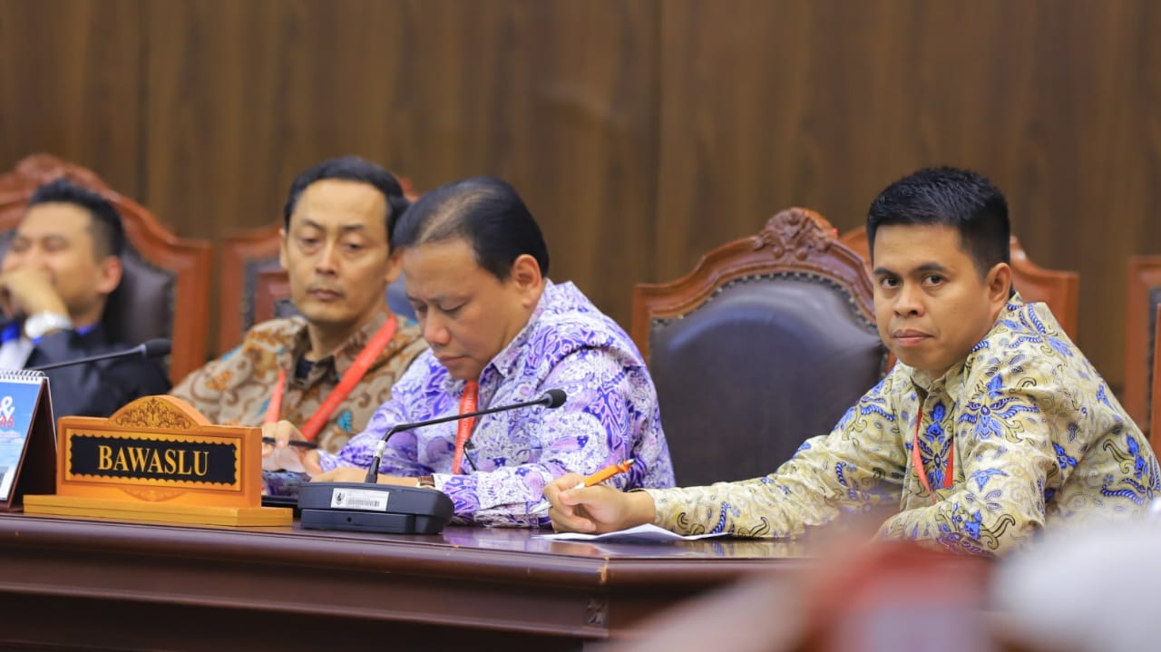 Ki-kan: Anggota Bawaslu Jabar Yusuf Kurnia, Ketua Bawaslu Abhan dan Ketua Bawaslu Sulteng Ruslan Husen saat mendengarkan putusan PHPU Pileg 2019 di Ruang Sidang MK, Jakarta, Jumat 9 Agustus 2019/Foto: Reyn Gloria