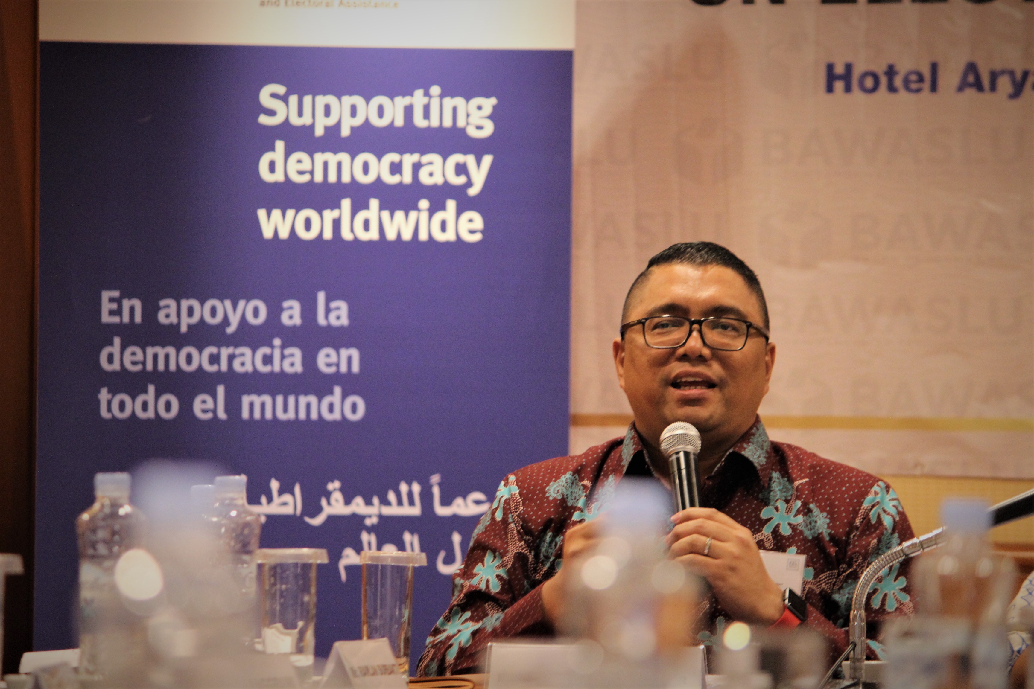 Fritz Edward Siregar saat memaparkan materinya dalam acara forum diskusi International Roundtable Meeting On Electoral Justice System. Bertempat di Jakarta, Rabu (02/04/2018)