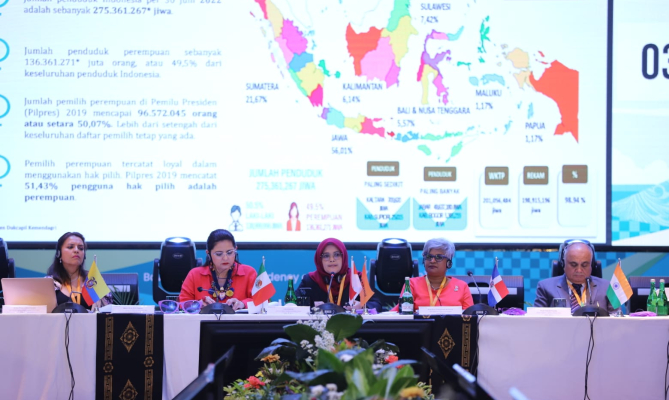 Bali, Badan Pengawas Pemilihan Umum - Para delegasi GNEJ dari berbagai negara berbagi cerita soal kesetaraan gender. Mulai dari perkembangan sampai tantangan yang terjadi saat ini. Hal tersebut diceritakan saat pleno keempat dalam sidang pleno kelima (Fifth Plenary Assembly) Global Network on Electoral Justice (GNEJ) di Bali, Selasa (11/10/2022).