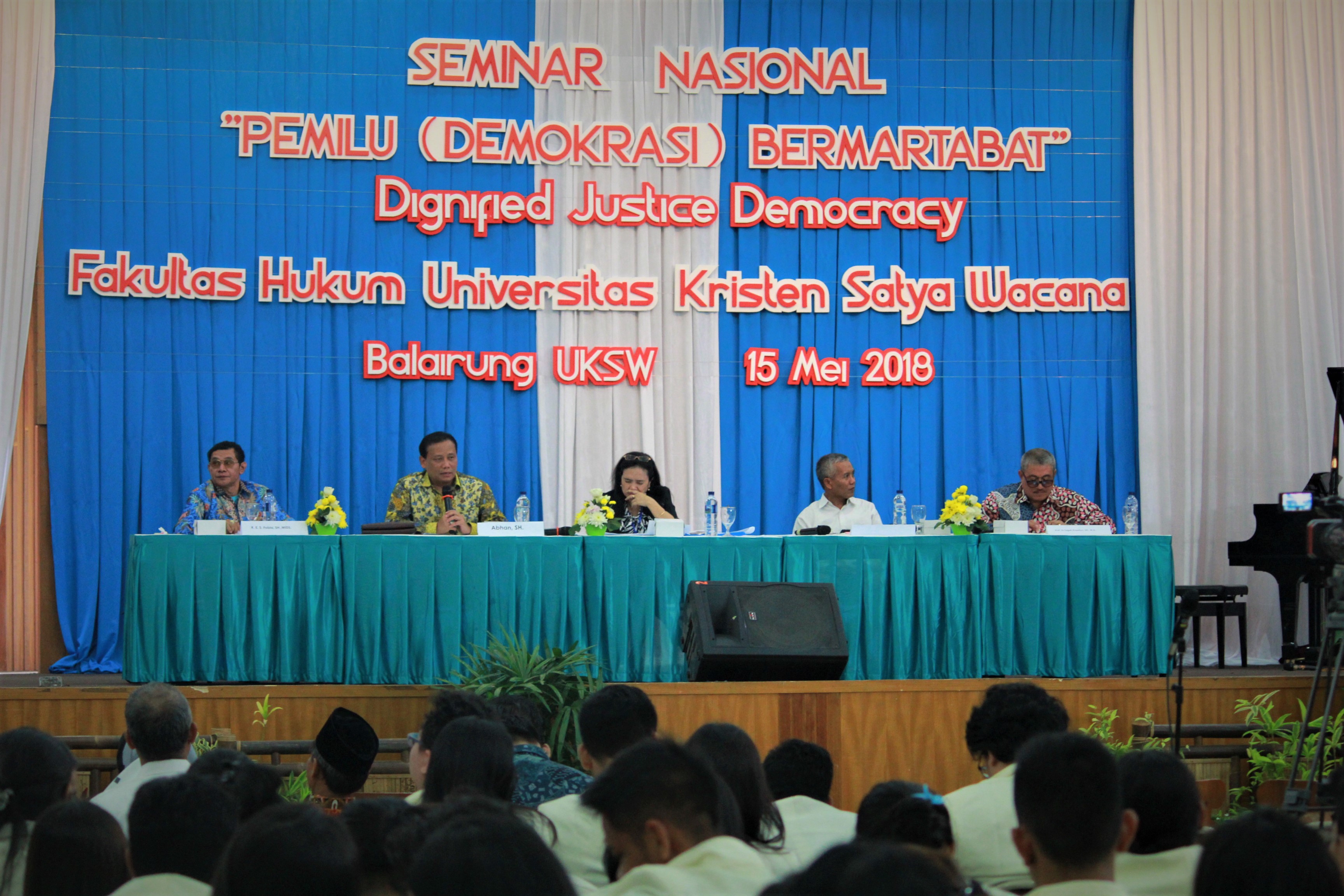 Ketua BAwaslu RI, Abhan saat menjadi narasumber dalam Seminar Nasional Pemilu (Demokrasi) yang Bermatabat yang diselenggarakan oleh Fakultas Hukum Universitas Kristen Satya Wacana (UKSW) Salatiga, di Gedung Balairung UKSW, Selasa (15/05/2018).