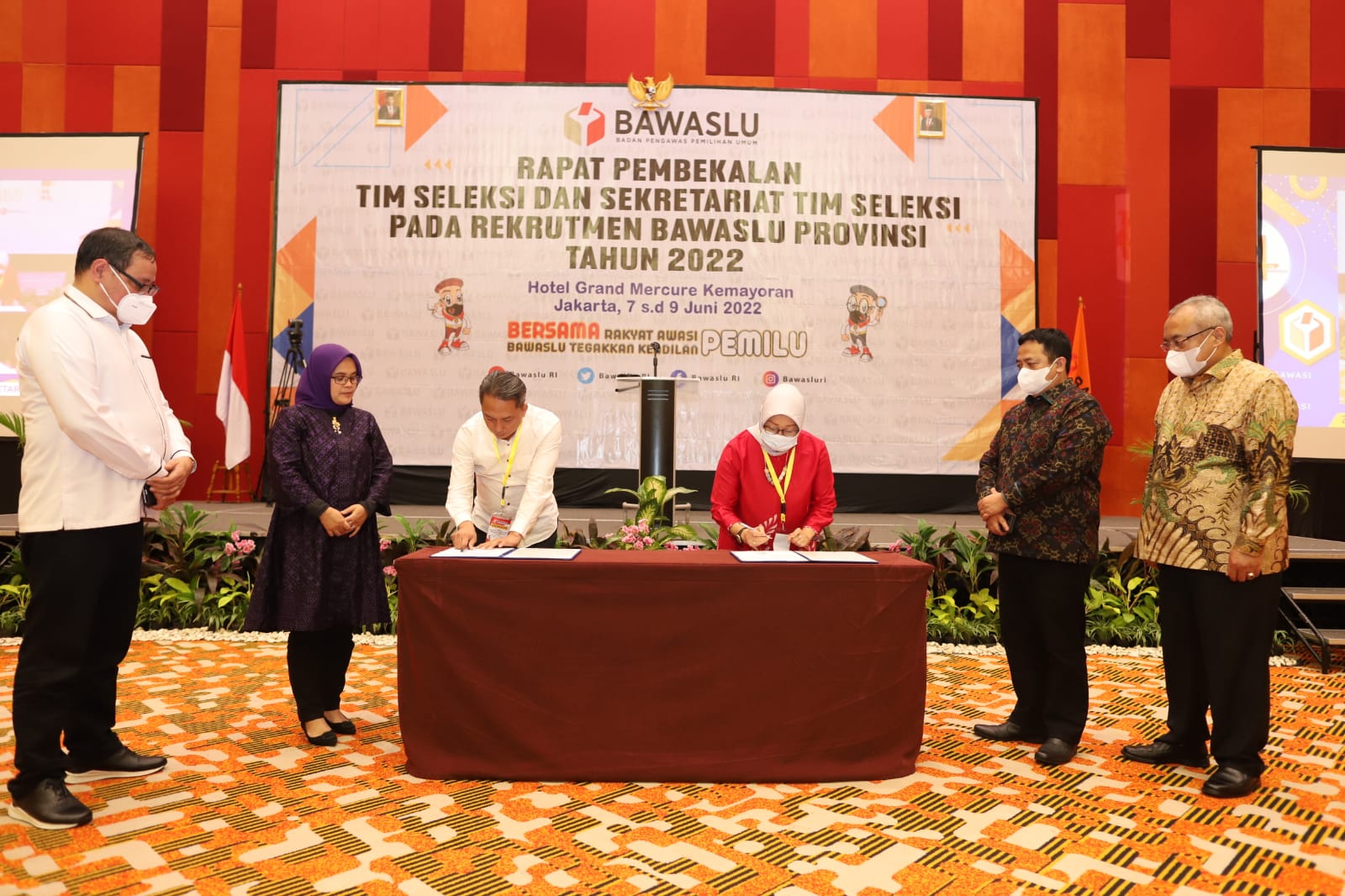 Jakarta, Badan Pengawas Pemilihan Umum - Sebanyak 125 orang secara sah melaksanakan tugas sebagai tim seleksi (timsel) Anggota Bawaslu Provinsi setelah mendapatkan pembekalan dan menandatangani pakta integritas di Jakarta, Rabu (8/6/2022) malam. Nantinya para timsel akan bekerja selama tiga bulan dalam proses penjaringan di 25 provinsi yang habis masa tugas tahun 2022.