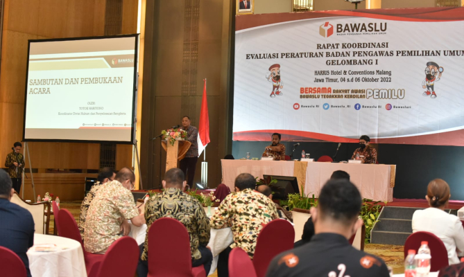 Anggota Bawaslu Totok Hariyono memberikan arahan dalam Rapat Koordinasi Peraturan Bawaslu Gelombang I di Malang, Jawa Timur, Rabu (5/10/2022).