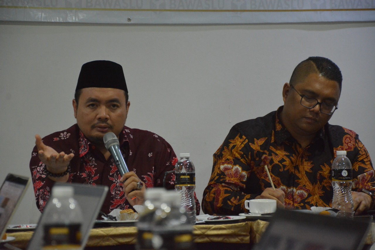 Anggota Bawaslu M Afifuddin (kiri) didampingi Anggota Bawaslu Fritz Edward Siregar saat menjadi pembicara Diskusi Kelompok Terpumpun (DKT) Tinjauan Hasil Pengolahan Data IKP 2020, Jumat (24/1/2020) malam/Foto: Christina Kartikawati