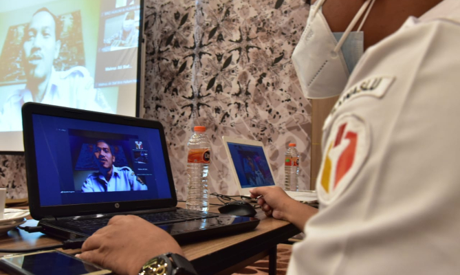 Karo Hukum dan Humas Bawaslu Agung Bagus Gede Bhayu Indra Atmaja memberikan arahan melalui virtual dalam Rapat Pemetaan Kebutuhan Perancangan Sistem Informasi Pengendalian Peraturan Bawaslu di Kota Bogor, Jawa Barat, Rabu (2/3/2022)/foto: Publikasi dan Pemberitaan Bawaslu