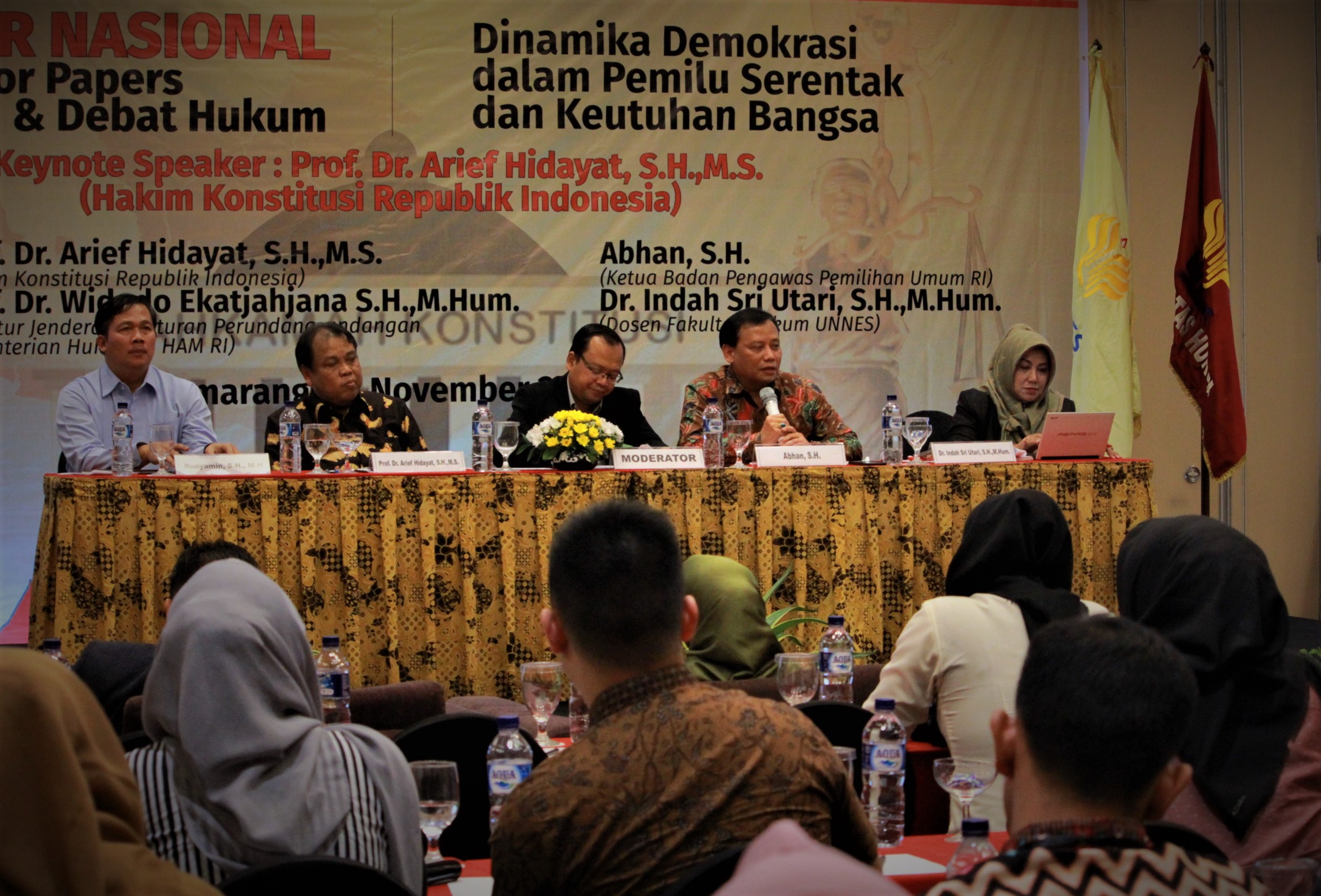 Dalam seminar ini dihadiri juga oleh Prof Arief Hidayat (Hakim Mahkamah Konstitusi), Bunyamin (Kepala Sub Direktorat Harmonisasi Bidang Politik, Hukum dan Keamanan pada Direktorat Harmonisasi Direktorat Jenderal Peraturan Perundang-undangan), dan Indah Sri Utari (Dosen Fakulas Hukum UNNES) sebagai narasumber.
