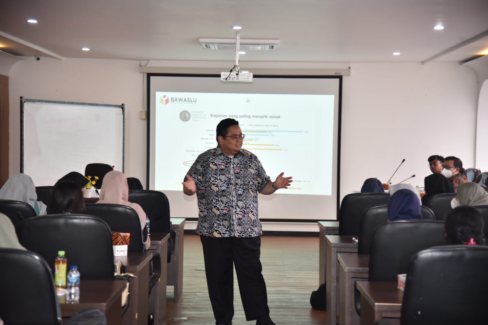 Salah satu peserta mahasiswa bertanya, bagaimana mahasiswa berperan dalam menangkal isu politik uang dan politisasi SARA? Menjawabnya, Bagja menerangkan, mahasiswa bisa turut aktif
