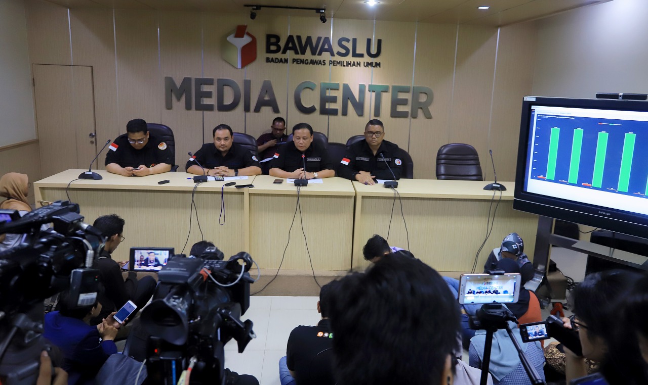 Jakarta, Badan Pengawas Pemilu – Rabu (17/4/2019) sore, Bawaslu menyampaikan laporan hasil pengawasan pemungutan suara di Media Centre Bawaslu, Jakarta. Dari laporan yang masuk, baik hasil supervisi anggota Bawaslu, maupun laporan Pengawas Tempat Pemungutan Suara (PTPS), banyak masalah yang terjadi seputar logistik pemilu dan hak memilih yang masih terabaikan.